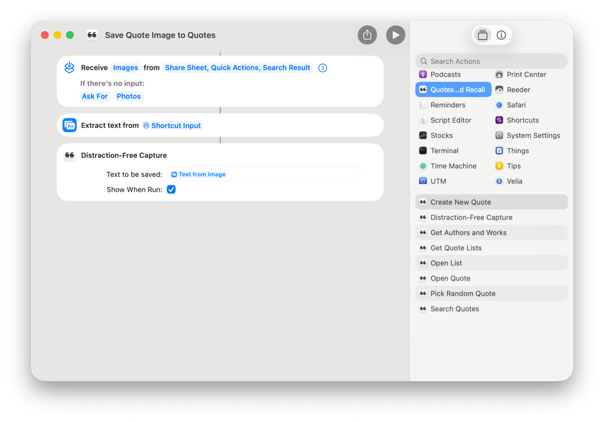 By connecting Quotesā āDistraction-Free Captureā with Appleās system-level OCR, like what I did in the above screenshot, you can create an image-to-text quote collector tailored exactly to your own workflow.